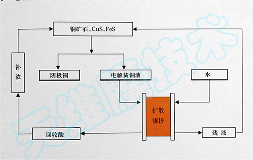 濕法煉銅生產(chǎn)中產(chǎn)生大量的電解貧液,若用石灰中和,除造成酸和銅的損失外,還引發(fā)環(huán)境問(wèn)題。用陰膜擴(kuò)散滲析回收電解貧液中的廢酸再返回系統(tǒng)使用,這樣既為企業(yè)節(jié)約了資源,又解決了環(huán)境污染問(wèn)題。